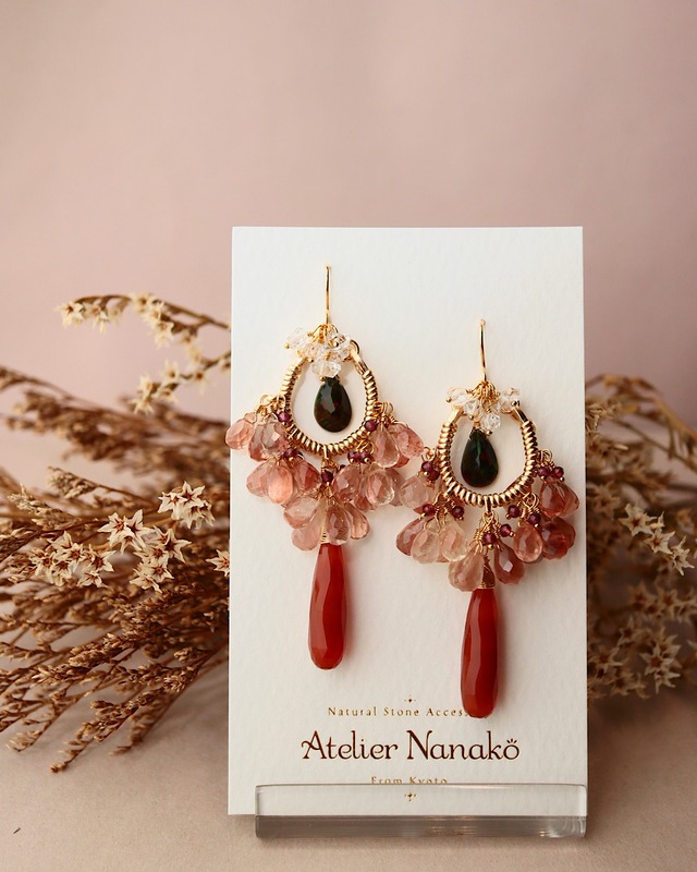 ※画像のお品が現物です。 ◇使用している石◇ サードニクス、オパール、ピンクサファイア、ピンクトルマリン、シトリン、ガーネット、ダブルポイント水晶 ◇ 金具について 14kgf(使用している金属全て) ※イヤリングの場合は、イヤリングパーツのみゴールドメッキとなります。 ◇金具交換について ピアス⇄イヤリングの金具交換を承ることもできます。チャームへの変更も可能。 購入時にメッセージ欄よりお知らせください。 特にご指定のない場合は、そのまま発送させていただきます。 ピアスフックをk18に変更することも出来ます。 ご希望の場合は別ページの金具変更オプションを同時にお買上げください。 ※プラス¥3,000(税込¥3,300) ◇サイズ 金具を含む全体の長さ→約68mm