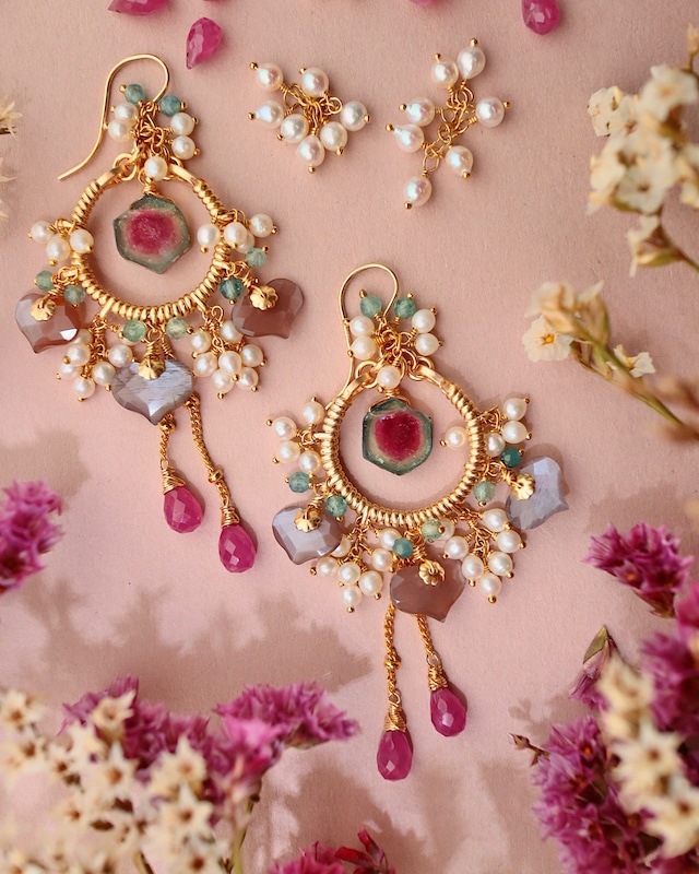 ※画像のお品が現物です。 ◇使用している石◇ ウォーターメロントルマリン、チョコレートムーンストーン、ピンクサファイア、ブルーグリーントルマリン、淡水パール ◇ 金具について 14kgf(使用している金属全て) ※イヤリングの場合は、イヤリングパーツのみゴールドメッキとなります。 ◇金具交換について ピアス⇄イヤリングの金具交換を承ることもできます。チャームへの変更も可能。 購入時にメッセージ欄よりお知らせください。 特にご指定のない場合は、そのまま発送させていただきます。 ピアスフックをk18に変更することも出来ます。 ご希望の場合は別ページの金具変更オプションを同時にお買上げください。 ※プラス¥3,000(税込¥3,300) ◇サイズ 金具を含む全体の長さ→約65mm