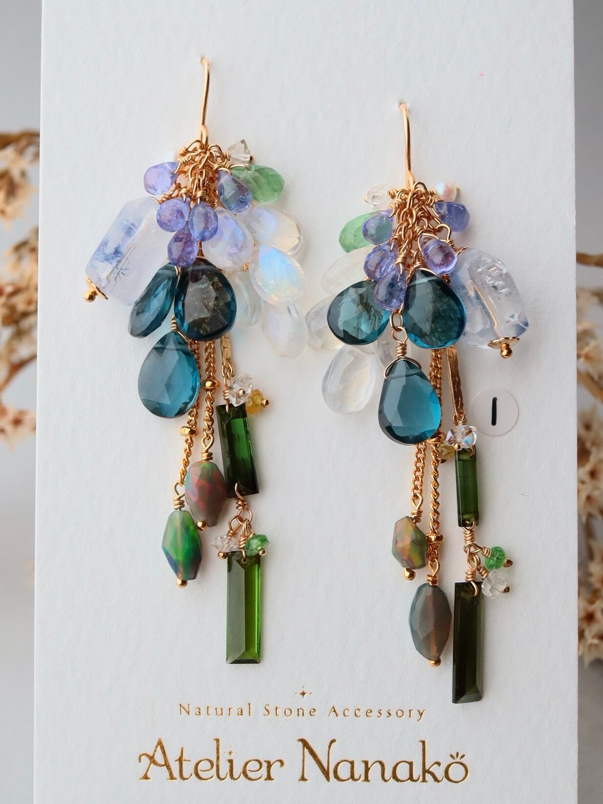 グリーントルマリン、デュモルチェライト・イン・クォーツ、ブラックオパール、ロンドンブルートパーズ、ムーンストーン、タンザナイト、グリーンカイヤナイト、淡水パール、ダブルポイント水晶、etc.