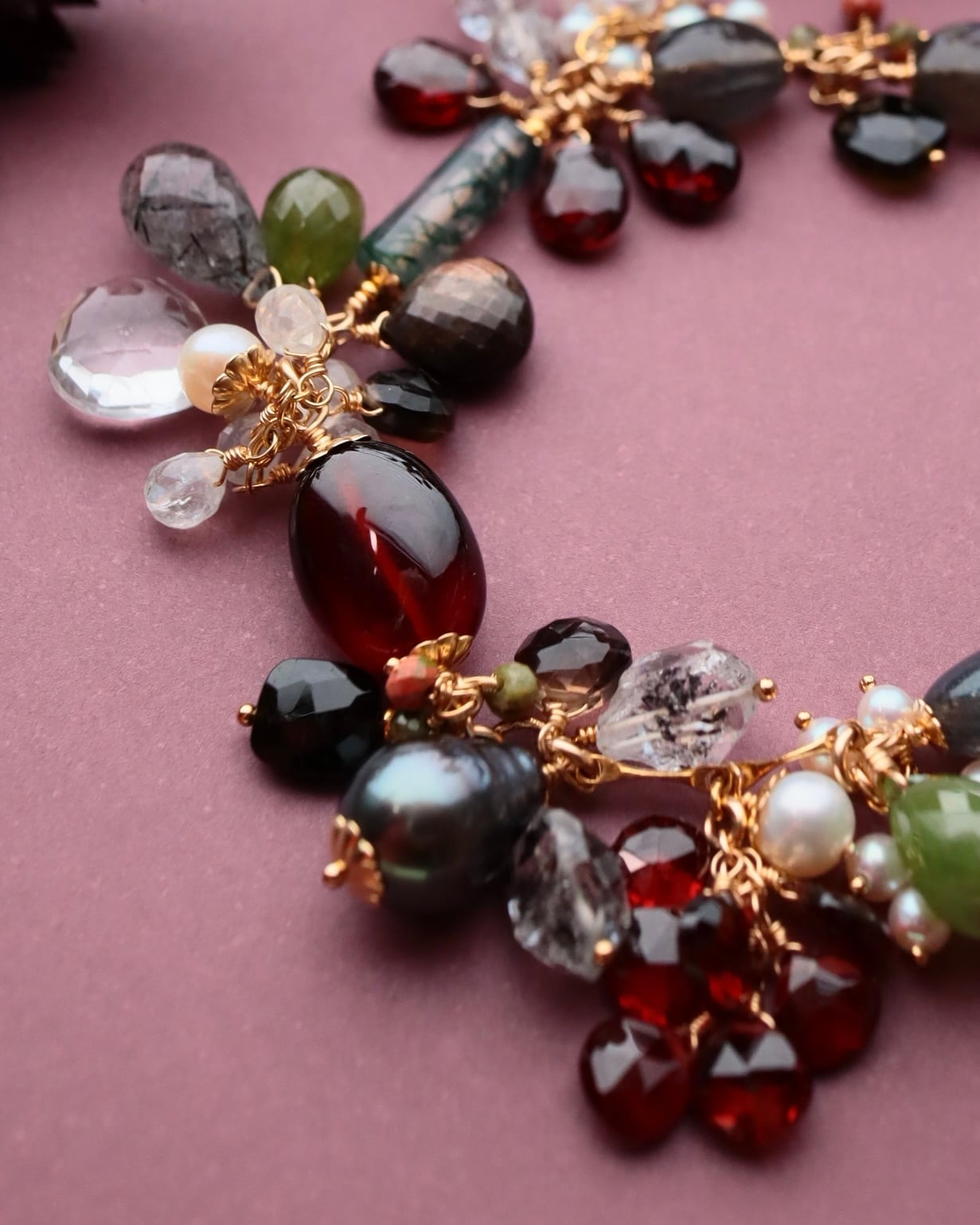 ガーネット、ブラックパール、ラブラドライト、グリーンサファイア、ゴールデンシラーサファイア、ブラックトルマリン、淡水パール、ダブルポイント水晶、ブラックルチルクォーツ、ムーンストーン、水晶、グリーンモスアゲート、スモーキークォーツ、ユナカイト