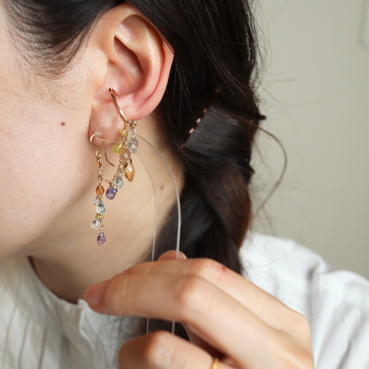 お耳の上の方からイヤカフを装着し、下に下ろしながらお耳に沿わせてください。