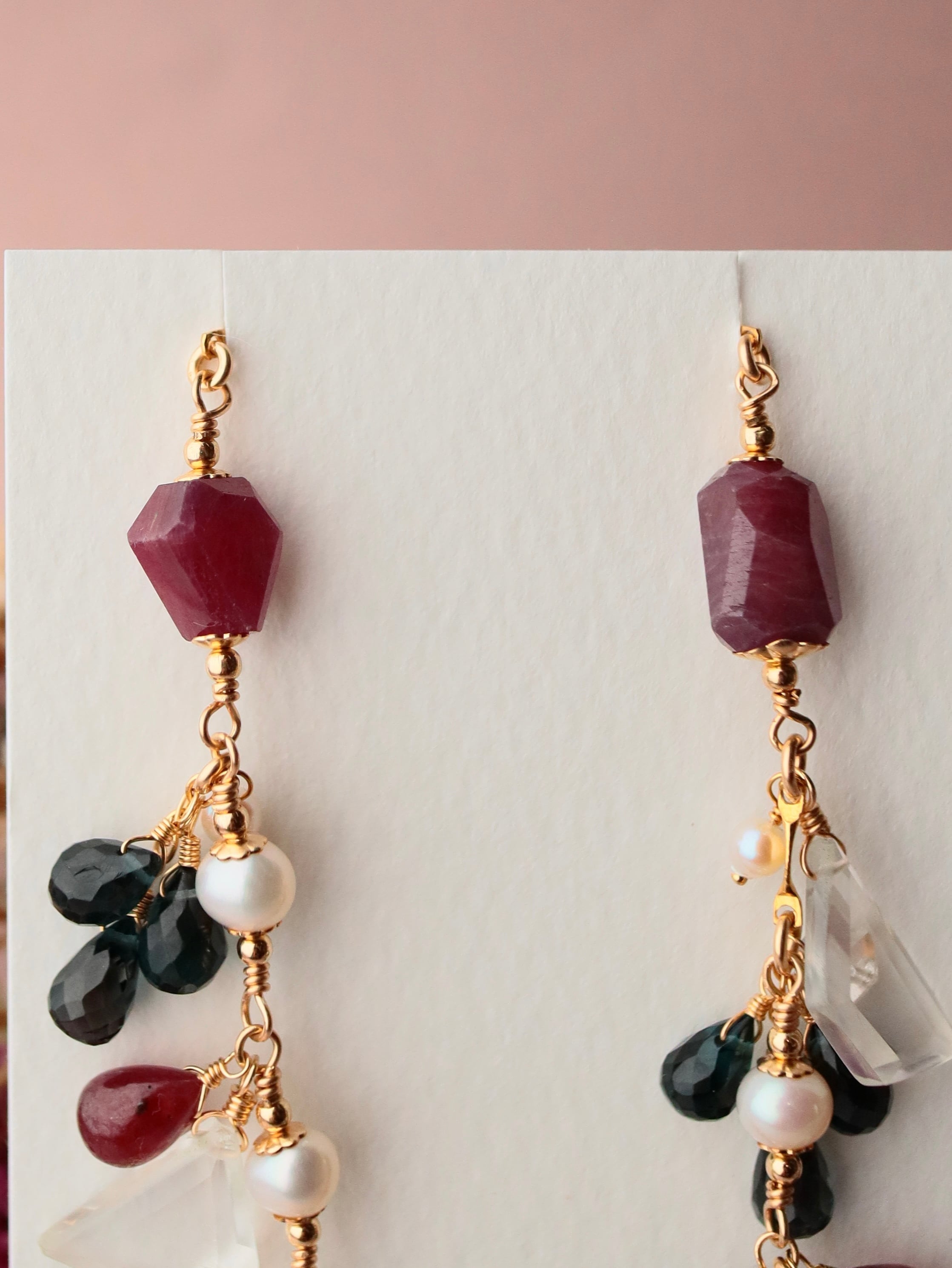 ルビー(未処理/メインストーン)、ルビー(処理済/ドロップ)、ロンドンブルートパーズ、アイオライト、ムーンストーン、淡水パール、ダブルポイント水晶