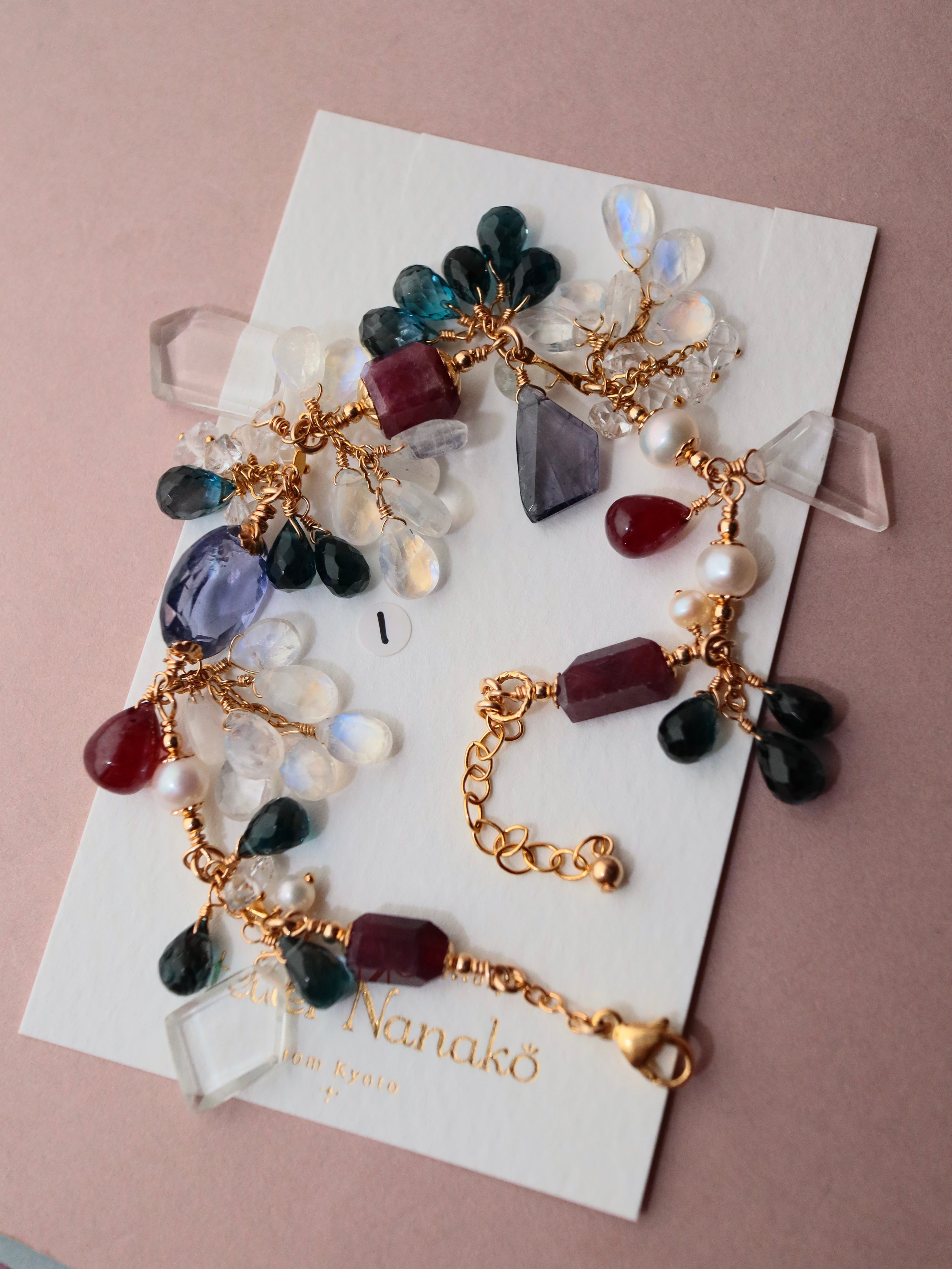 ルビー(未処理/メインストーン)、ルビー(処理済/ドロップ)、ロンドンブルートパーズ、アイオライト、ムーンストーン、淡水パール、ダブルポイント水晶