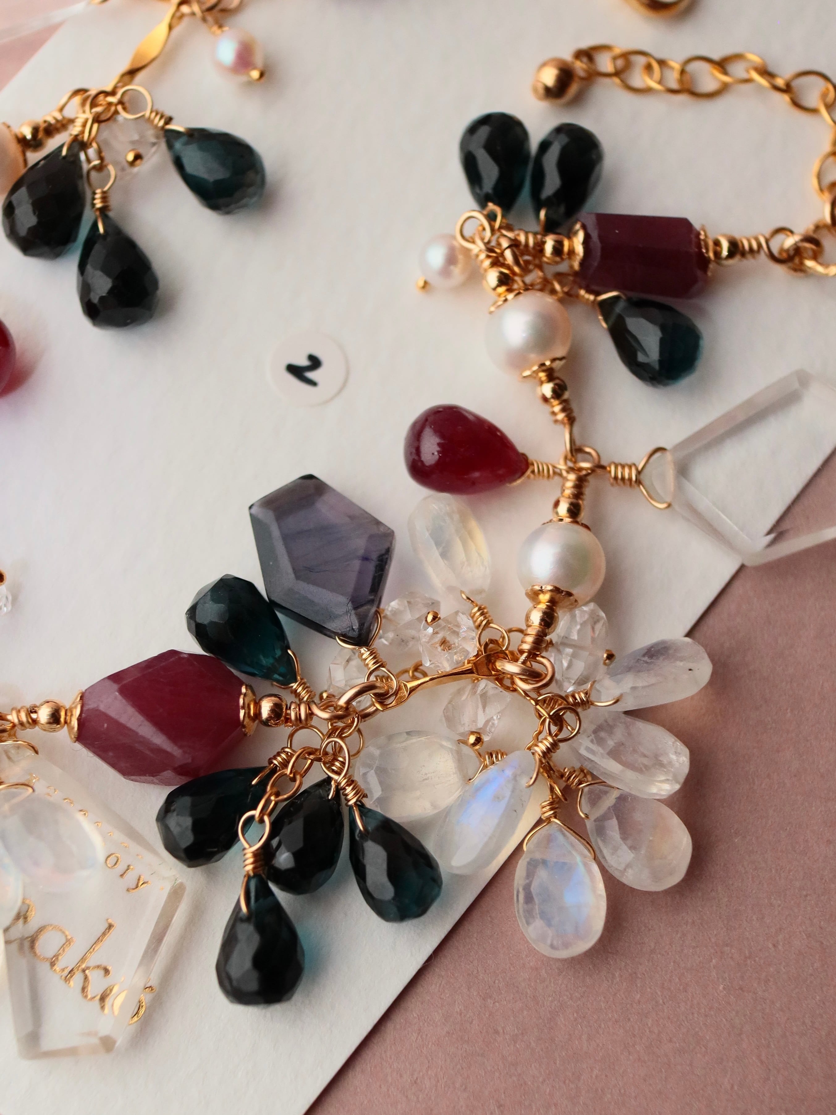 ルビー(未処理/メインストーン)、ルビー(処理済/ドロップ)、ロンドンブルートパーズ、アイオライト、ムーンストーン、淡水パール、ダブルポイント水晶