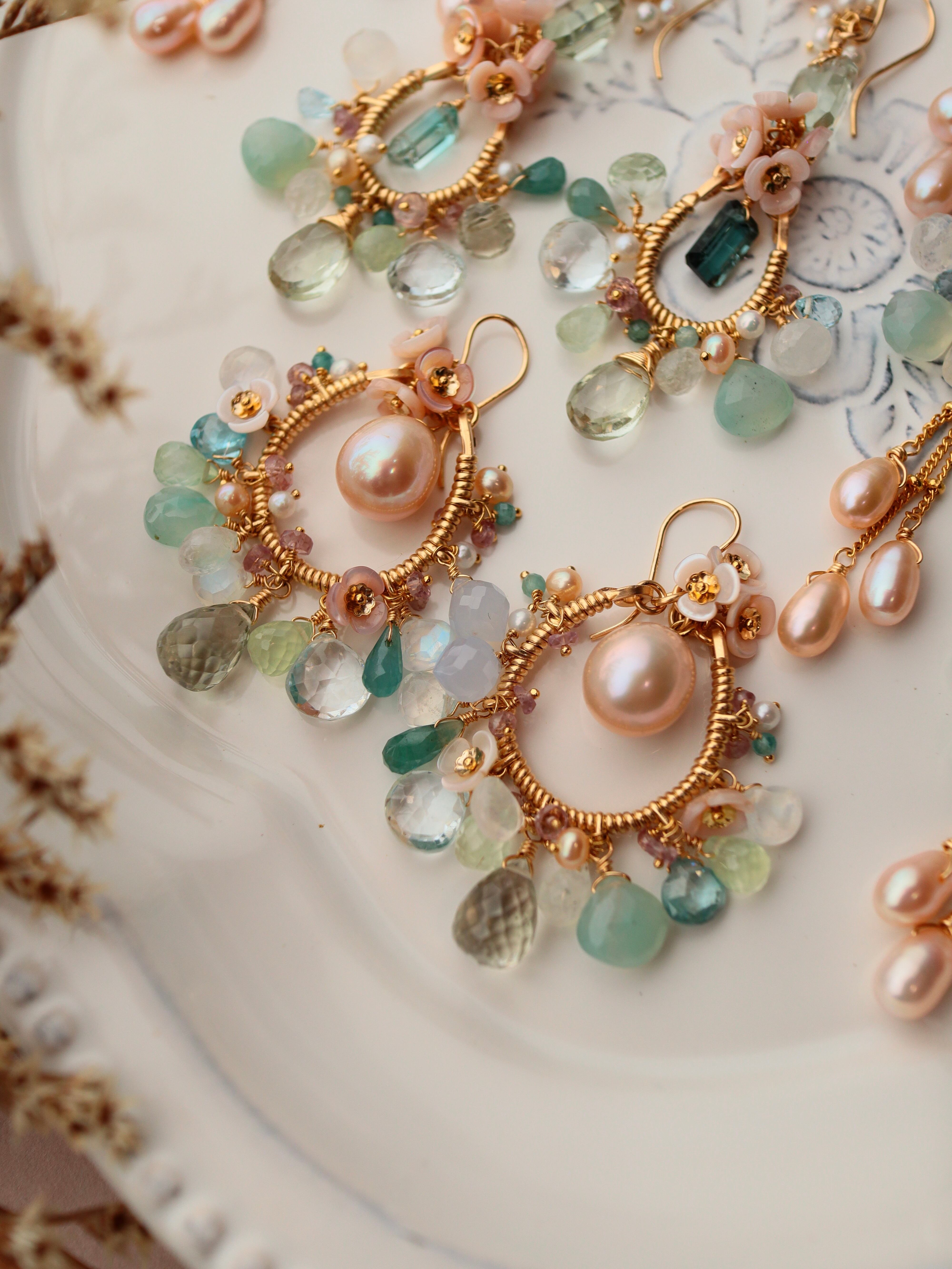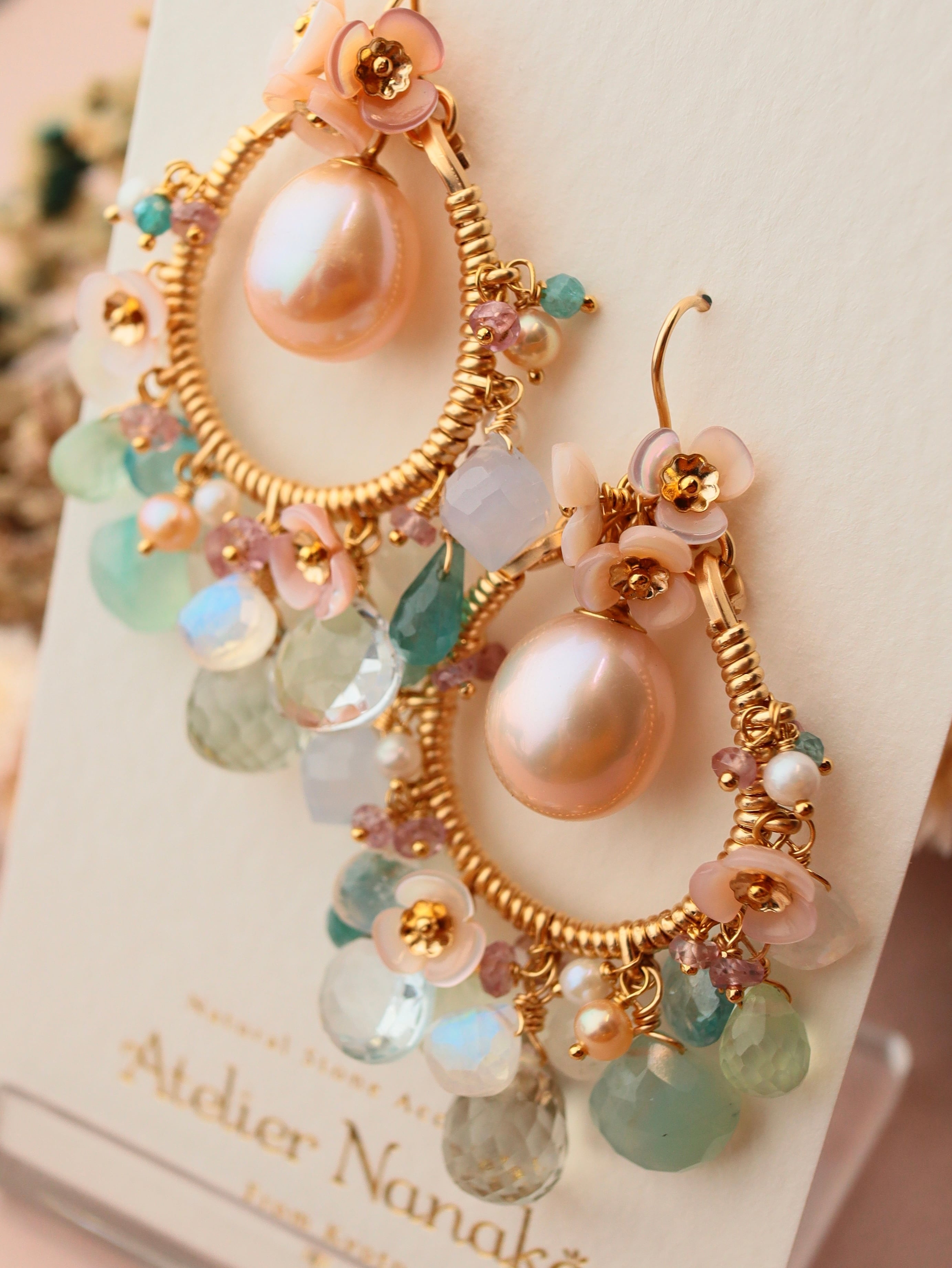 淡水パール(ピンク・白)、アクアプレーズ、グリーンアメジスト、ピンクシェル、プレナイト、ムーンストーン、ブルーカルセドニー、グランディディエライト、ブルージルコン、スカイブルートパーズ、ピンクサファイア
