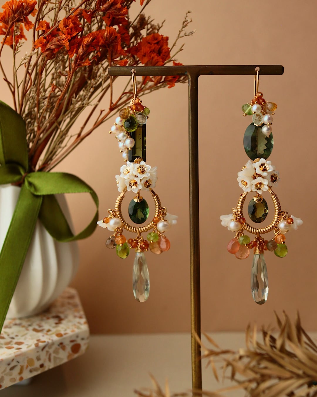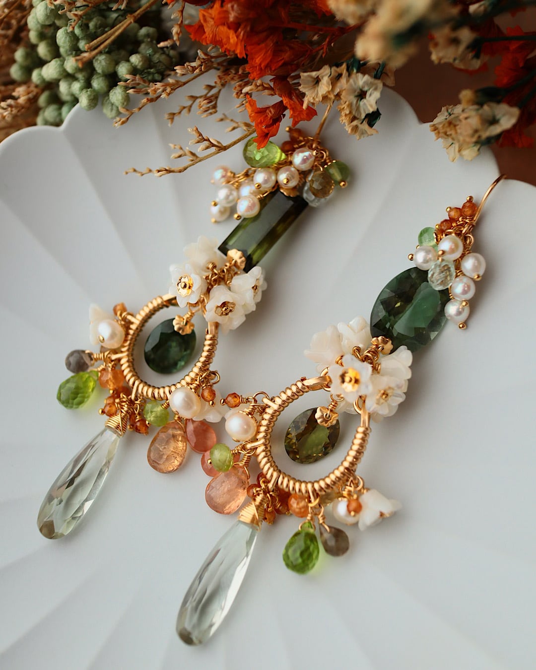 グリーントルマリン、グリーンアメジスト、インペリアルトパーズ、ペリドット、ホワイトシェル、淡水パール、オレンジガーネット、インカローズ、シトリン etc.