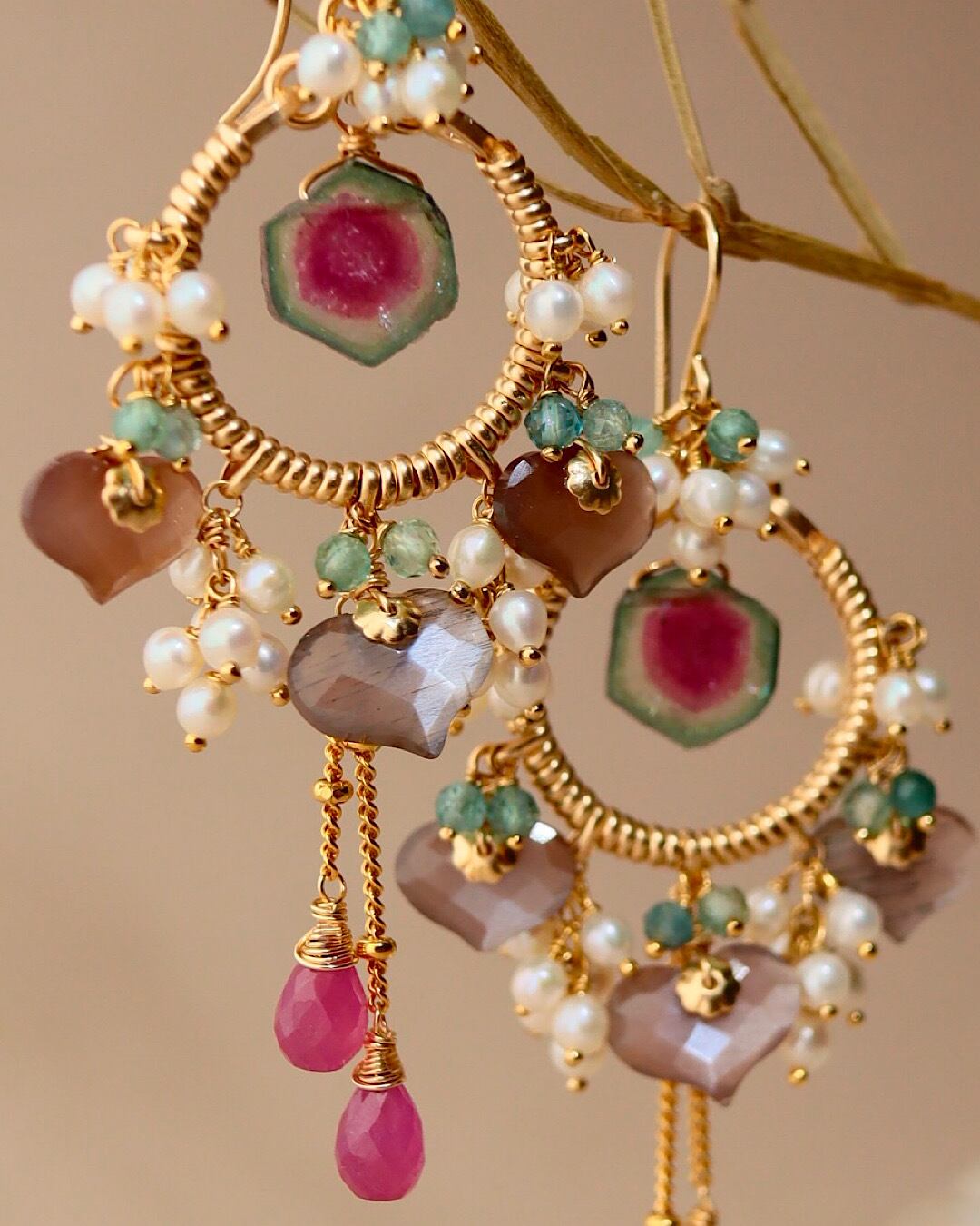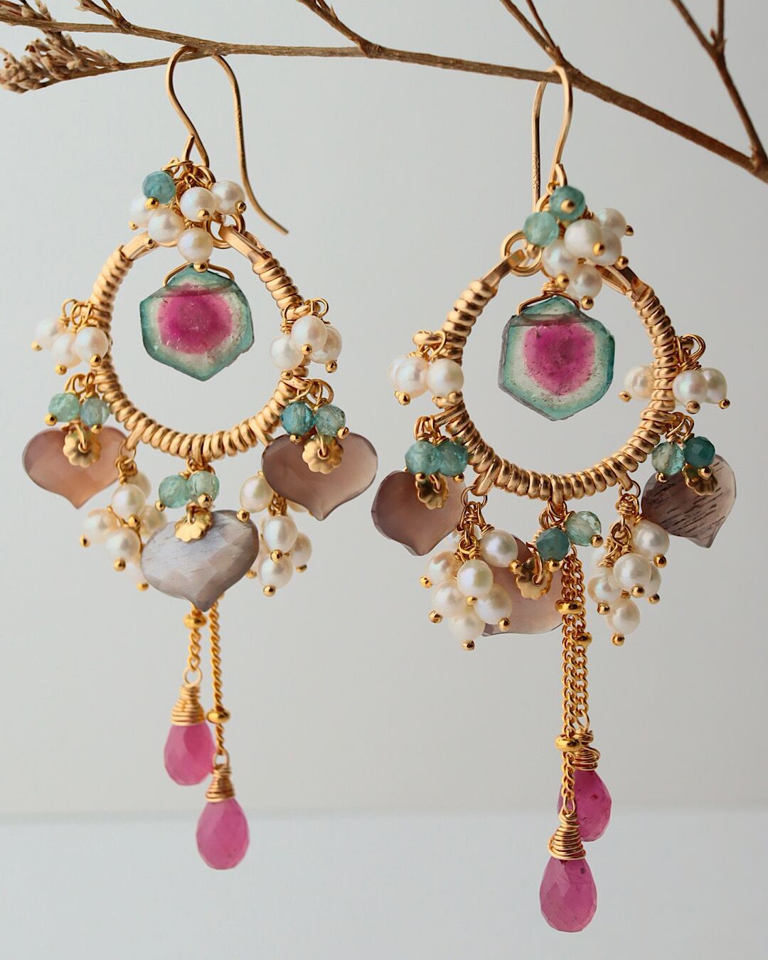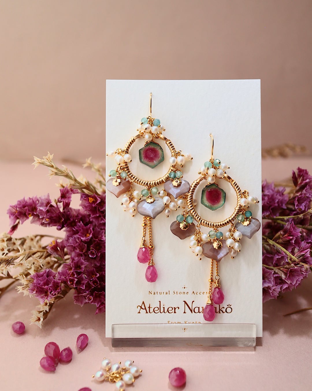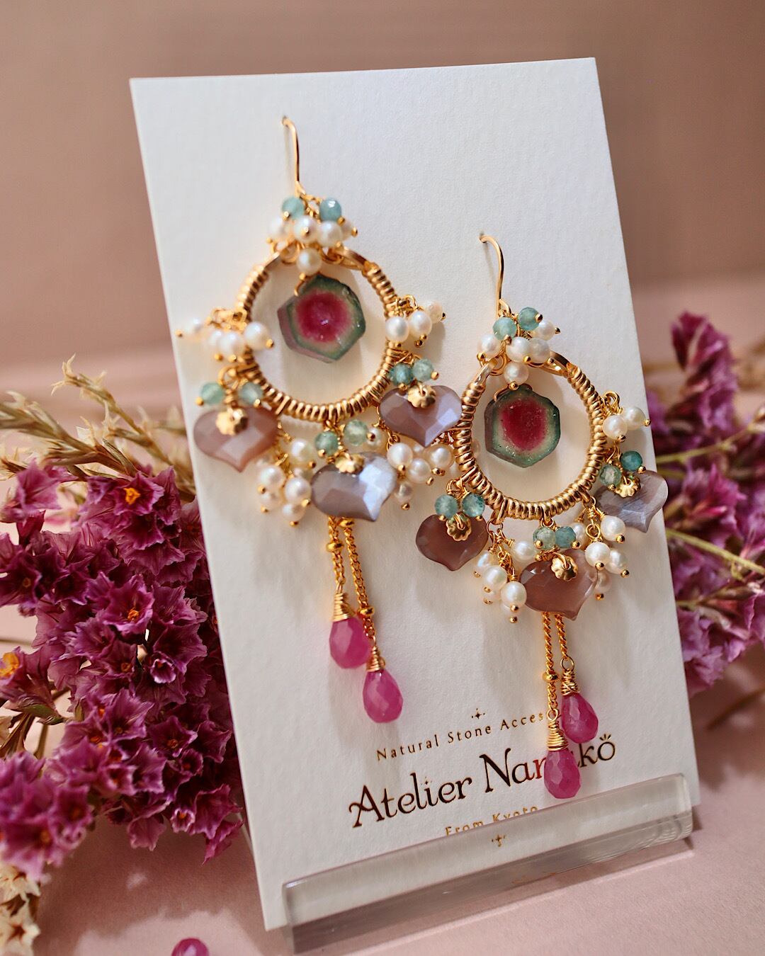 ウォーターメロントルマリン、チョコレートムーンストーン、ピンクサファイア、ブルーグリーントルマリン、淡水パール