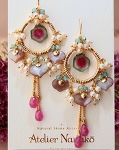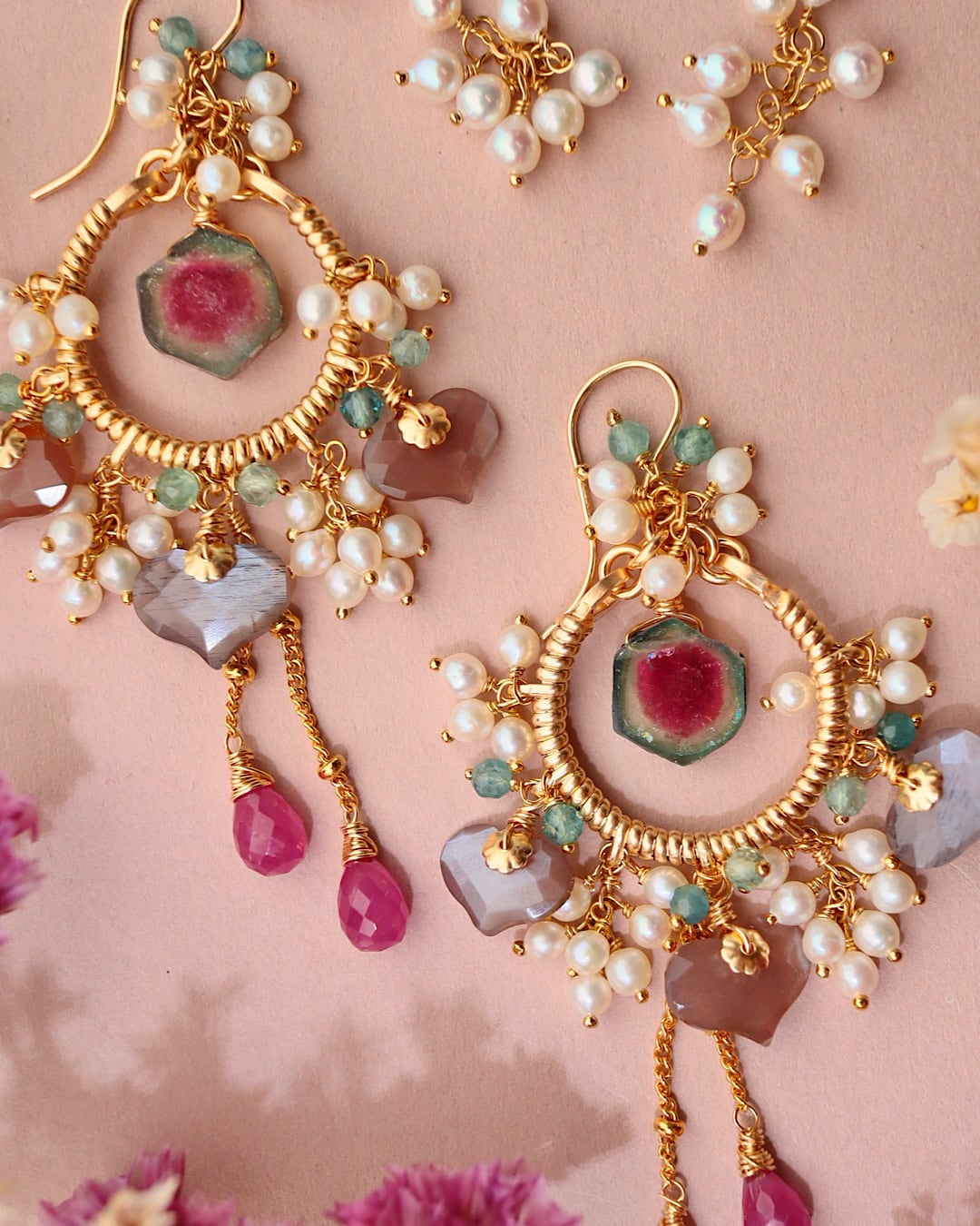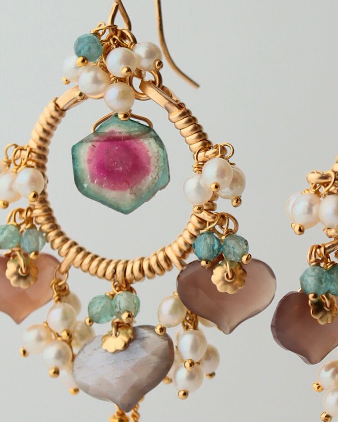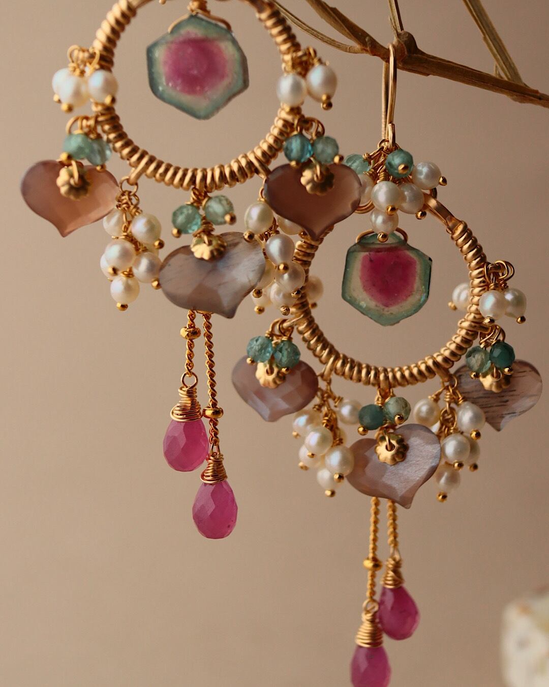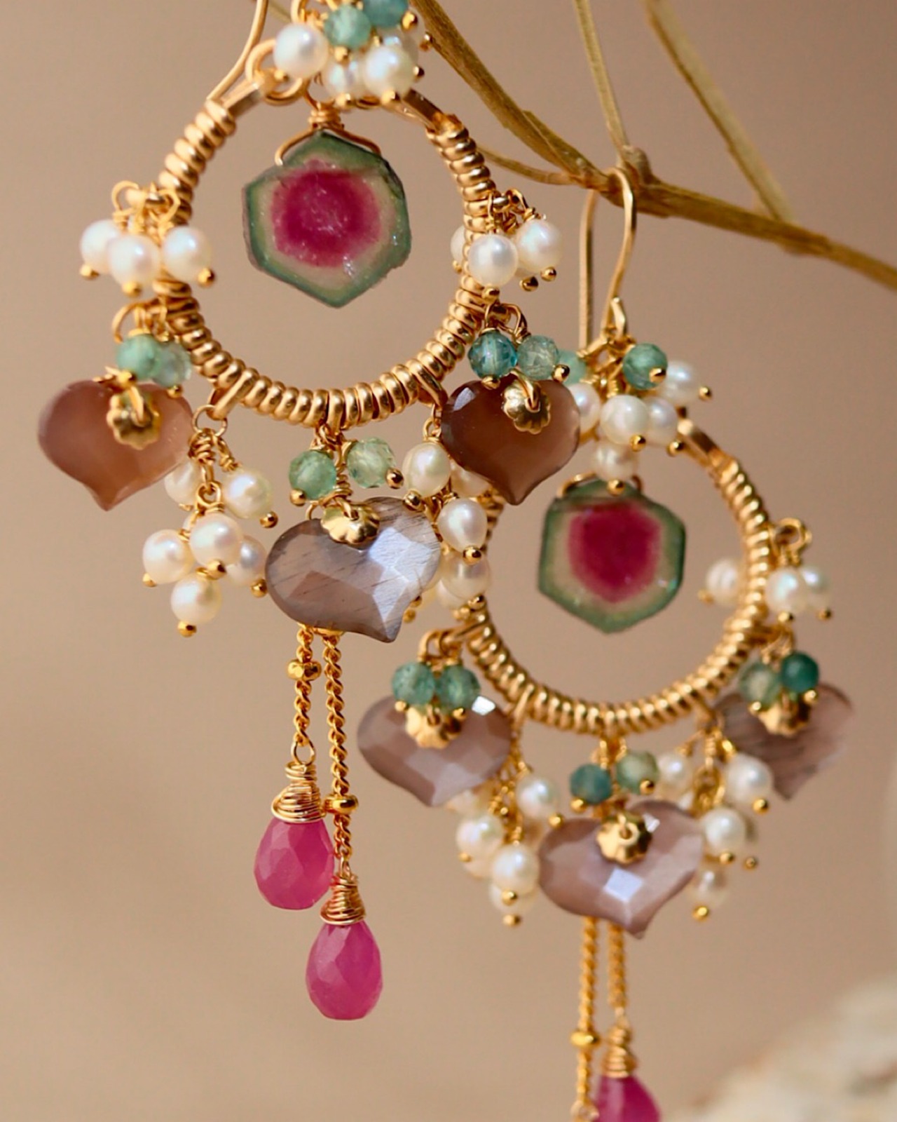 ウォーターメロントルマリン、チョコレートムーンストーン、ピンクサファイア、ブルーグリーントルマリン、淡水パール