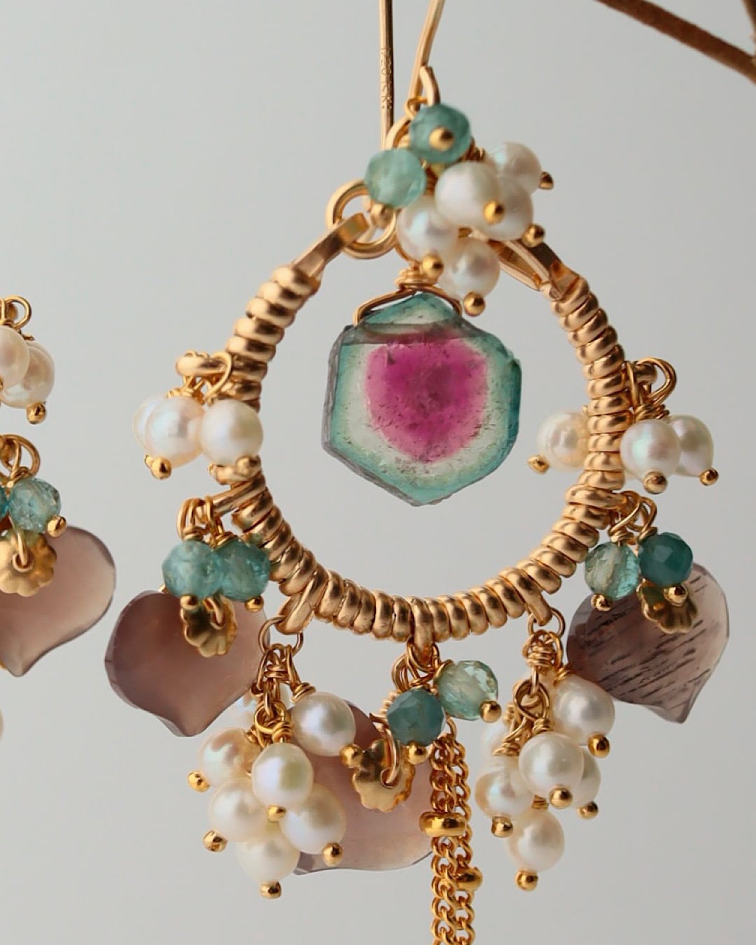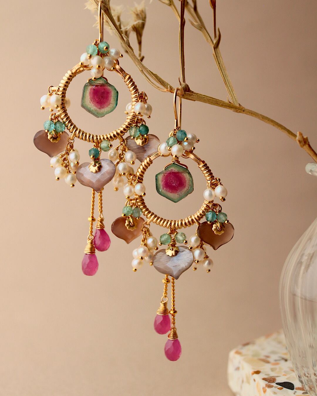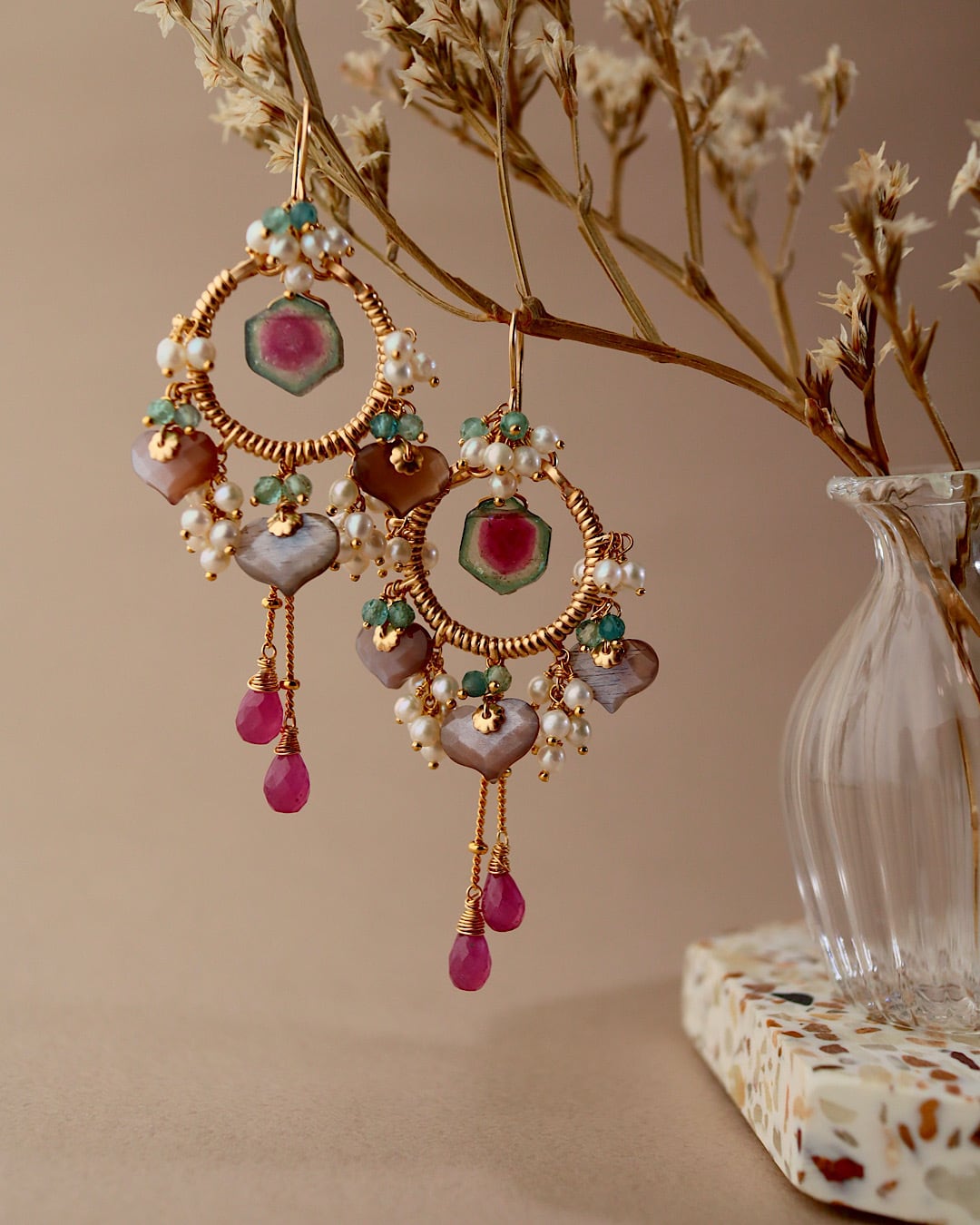 【1点もの】ウォーターメロントルマリンとチョコレートムーンストーンのシャンデリアピアス/イヤリング