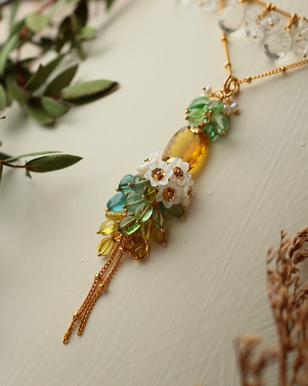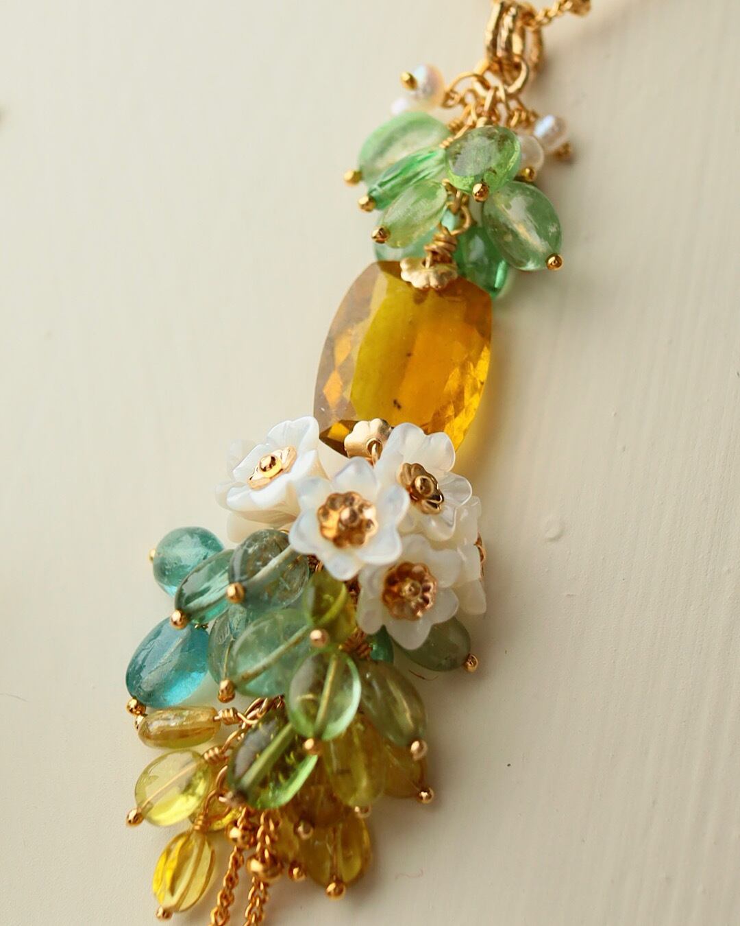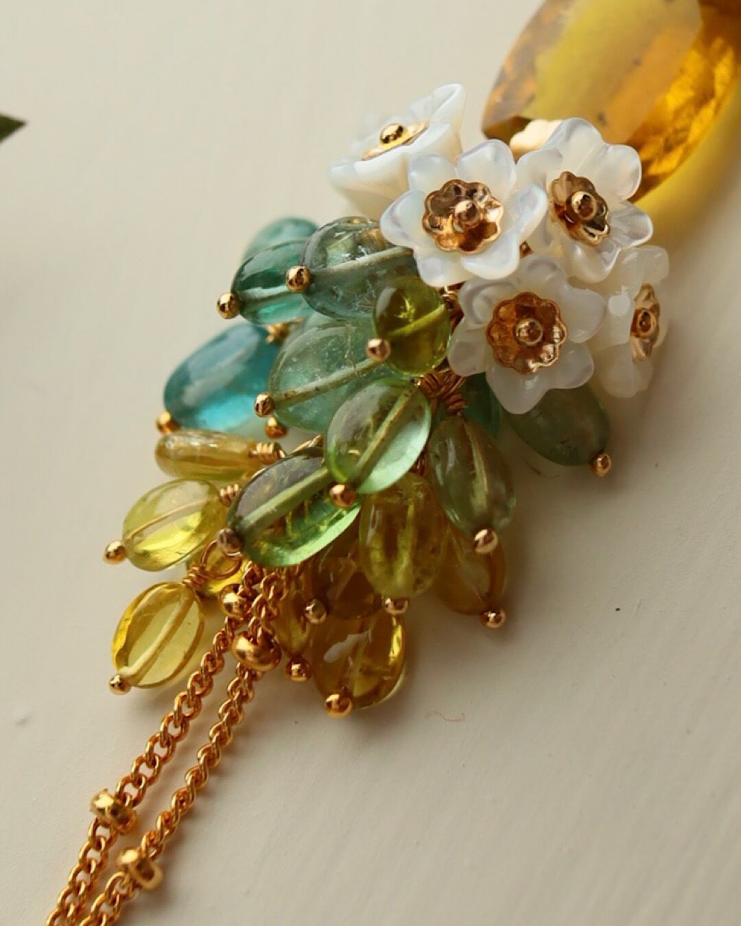 イエロートルマリン(大粒レクタングル)、トルマリン(ブルー、グリーン、イエロー)、ホワイトシェル、淡水パール
