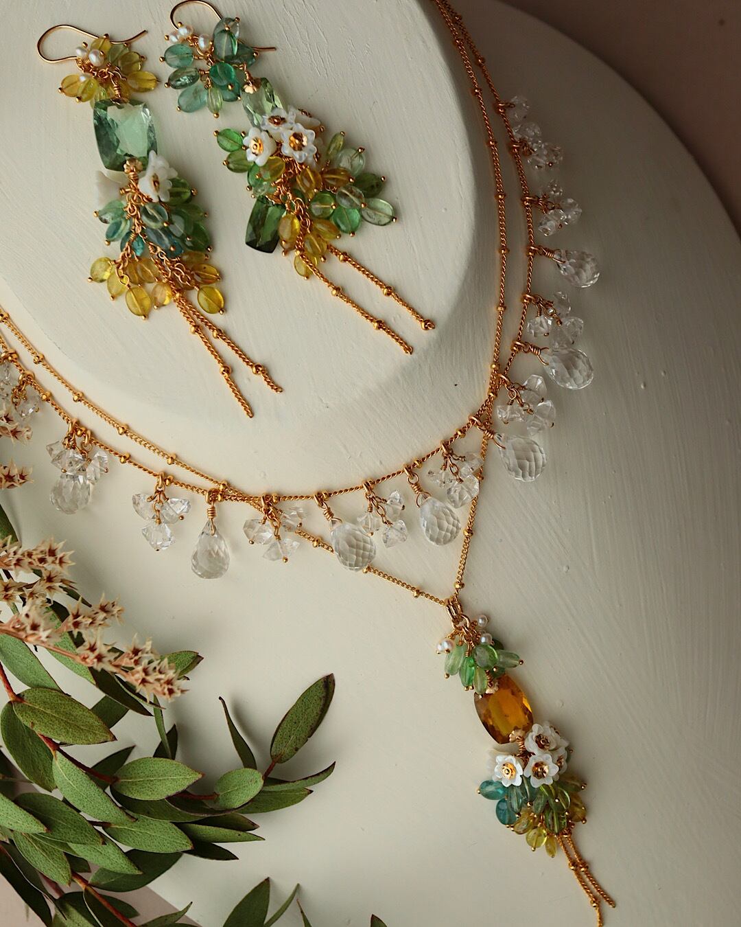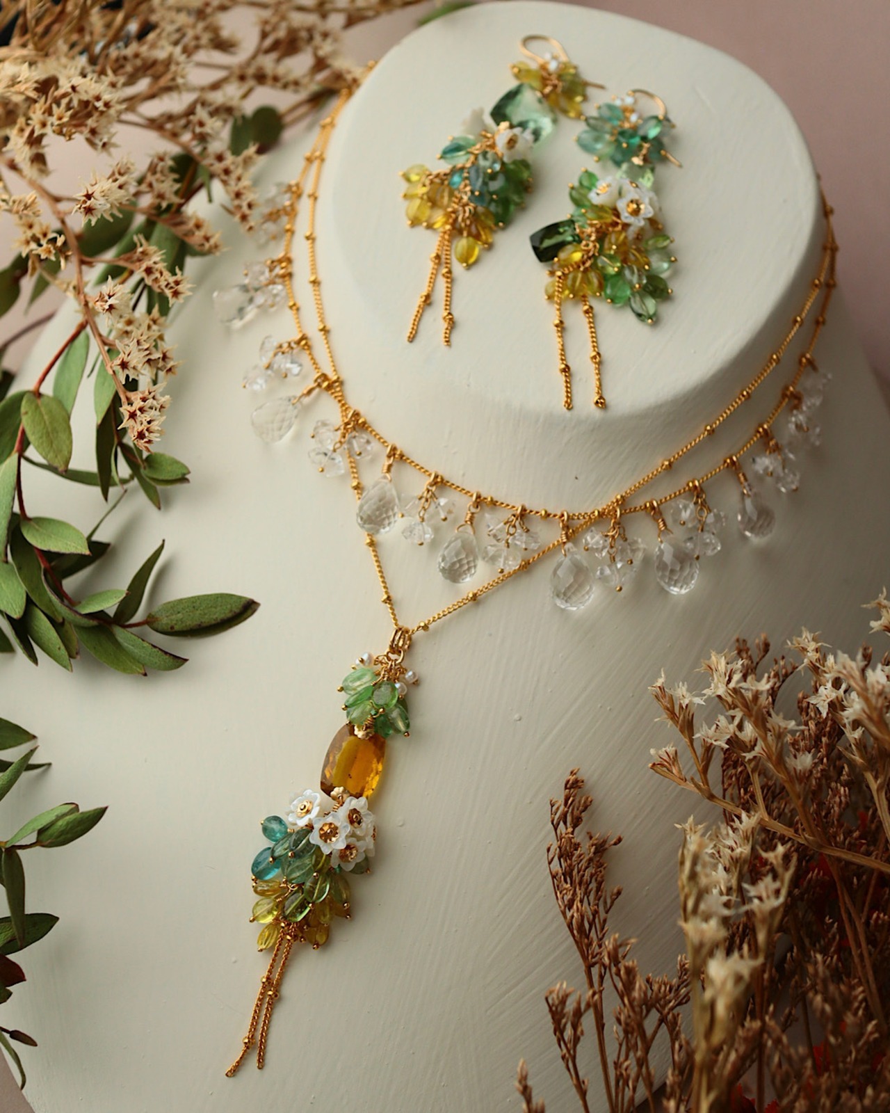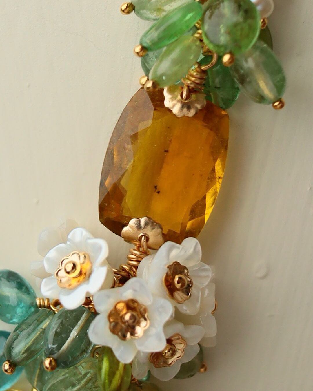 イエロートルマリン(大粒レクタングル)、トルマリン(ブルー、グリーン、イエロー)、ホワイトシェル、淡水パール