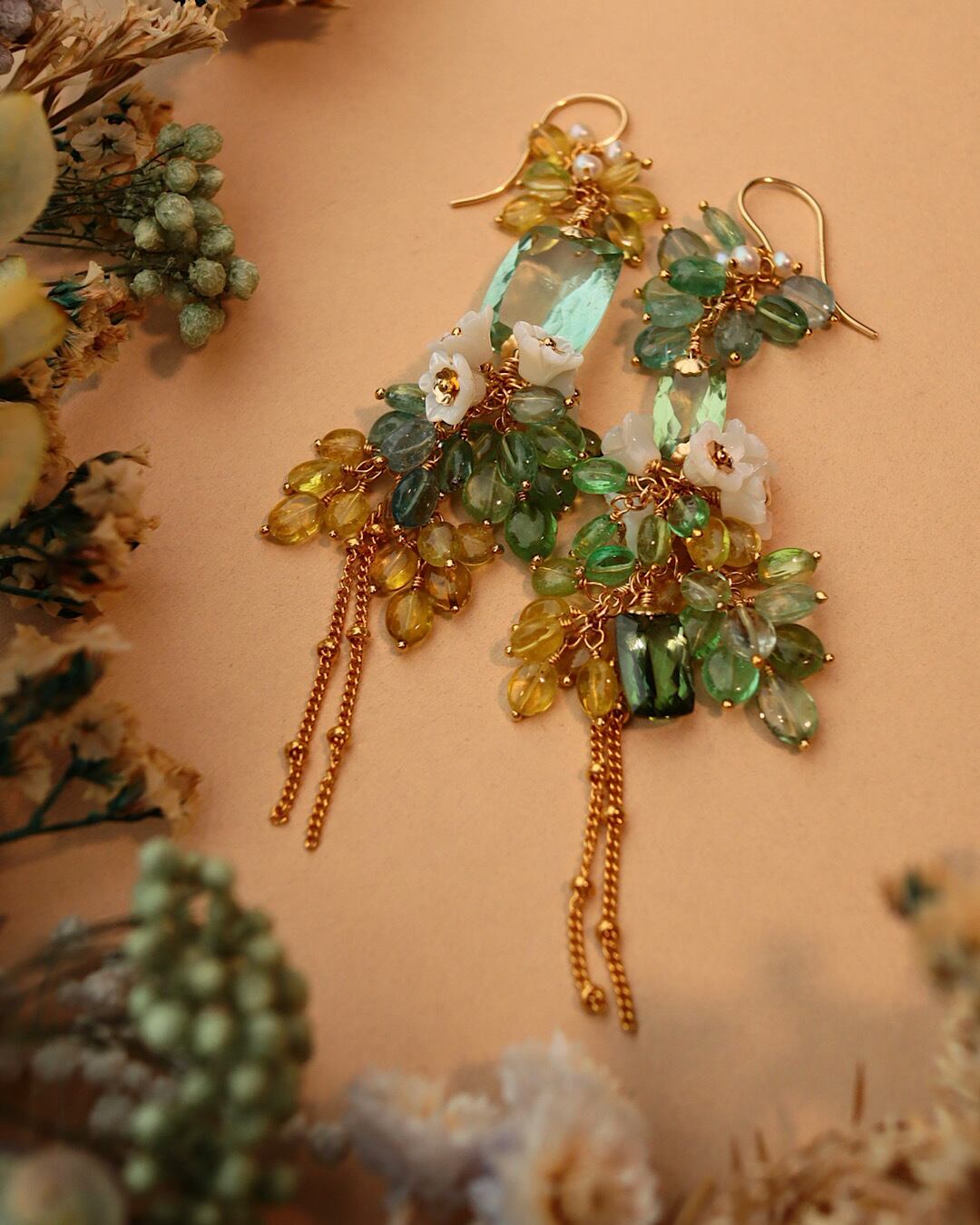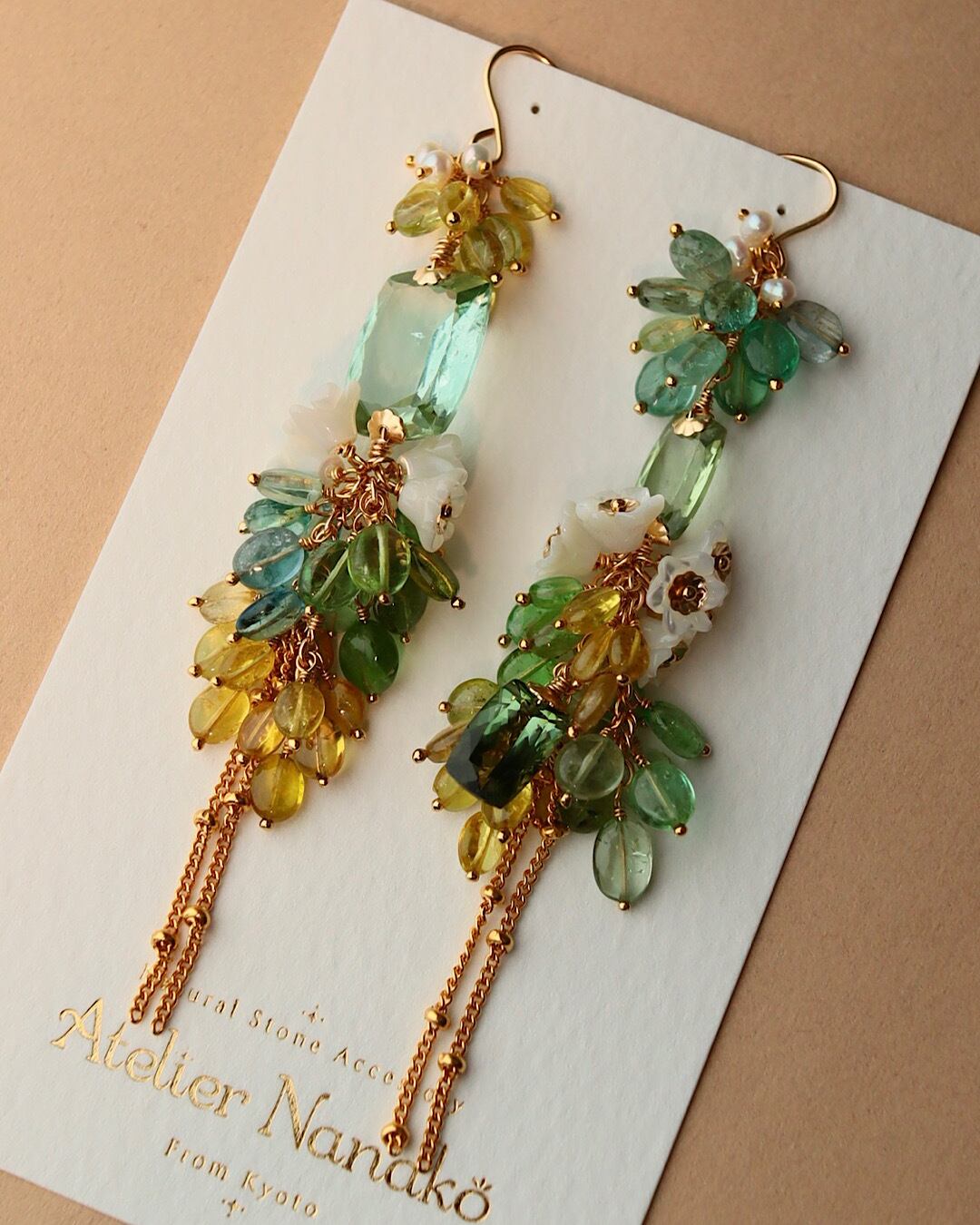 グリーントルマリン(レクタングル)、トルマリン(ブルー、グリーン、イエロー)、ホワイトシェル、淡水パール