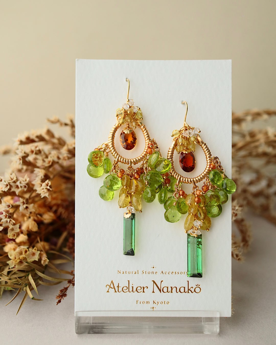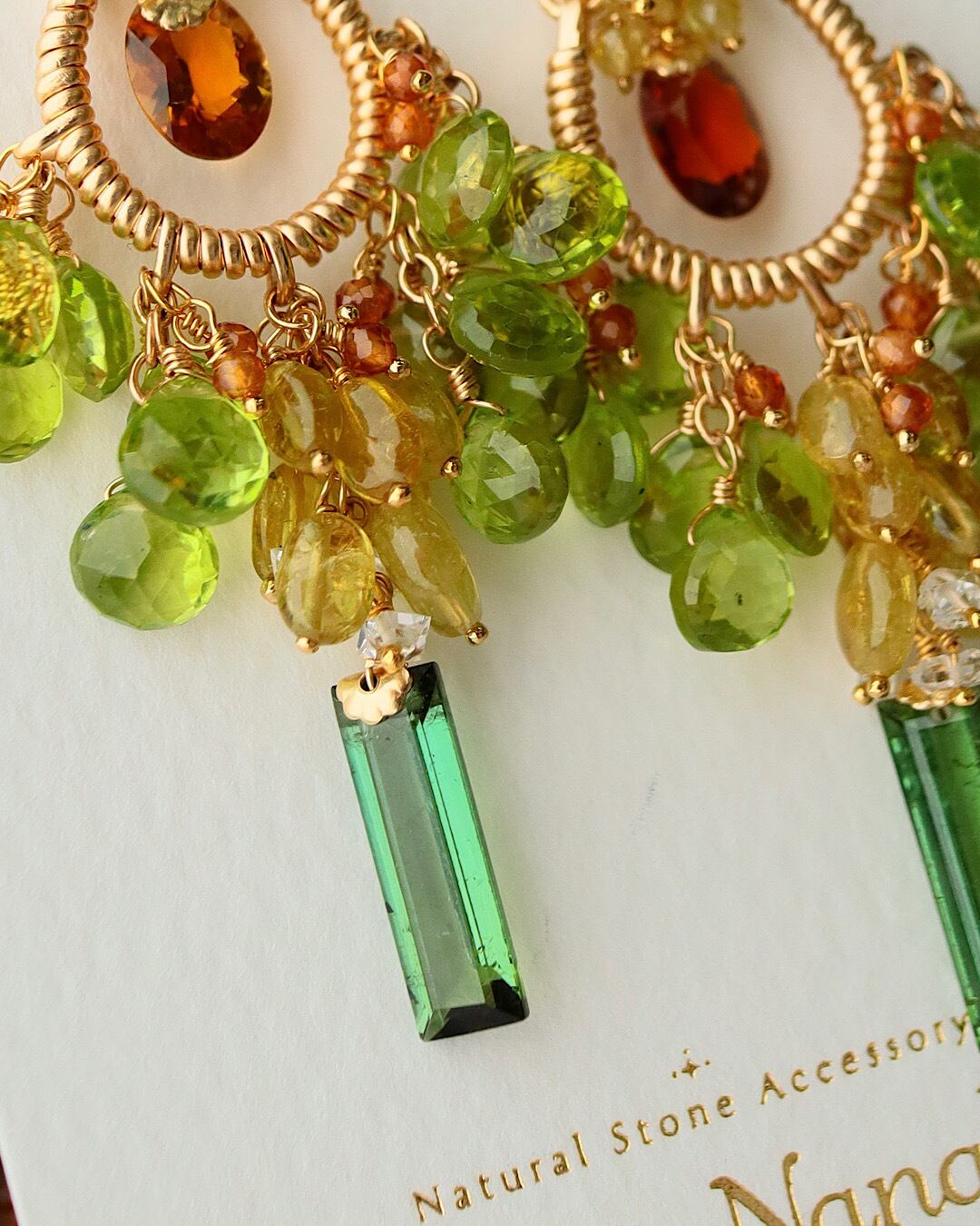 トルマリン(オーバル:オレンジブラウン、レクタングル:グリーン、小粒オーバル:イエロー)、ペリドット、イエローサファイア、ダブルポイント水晶、ヘソナイト