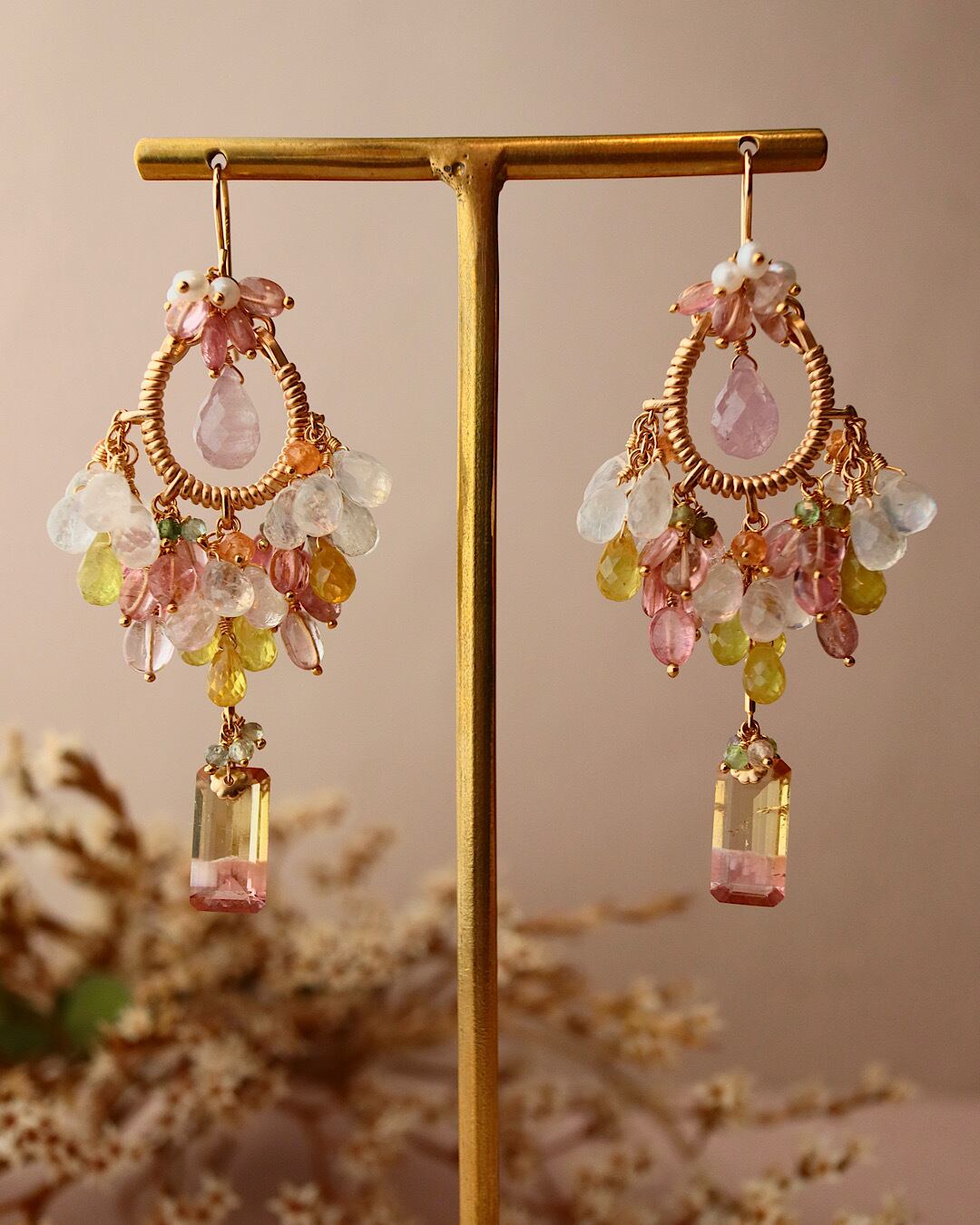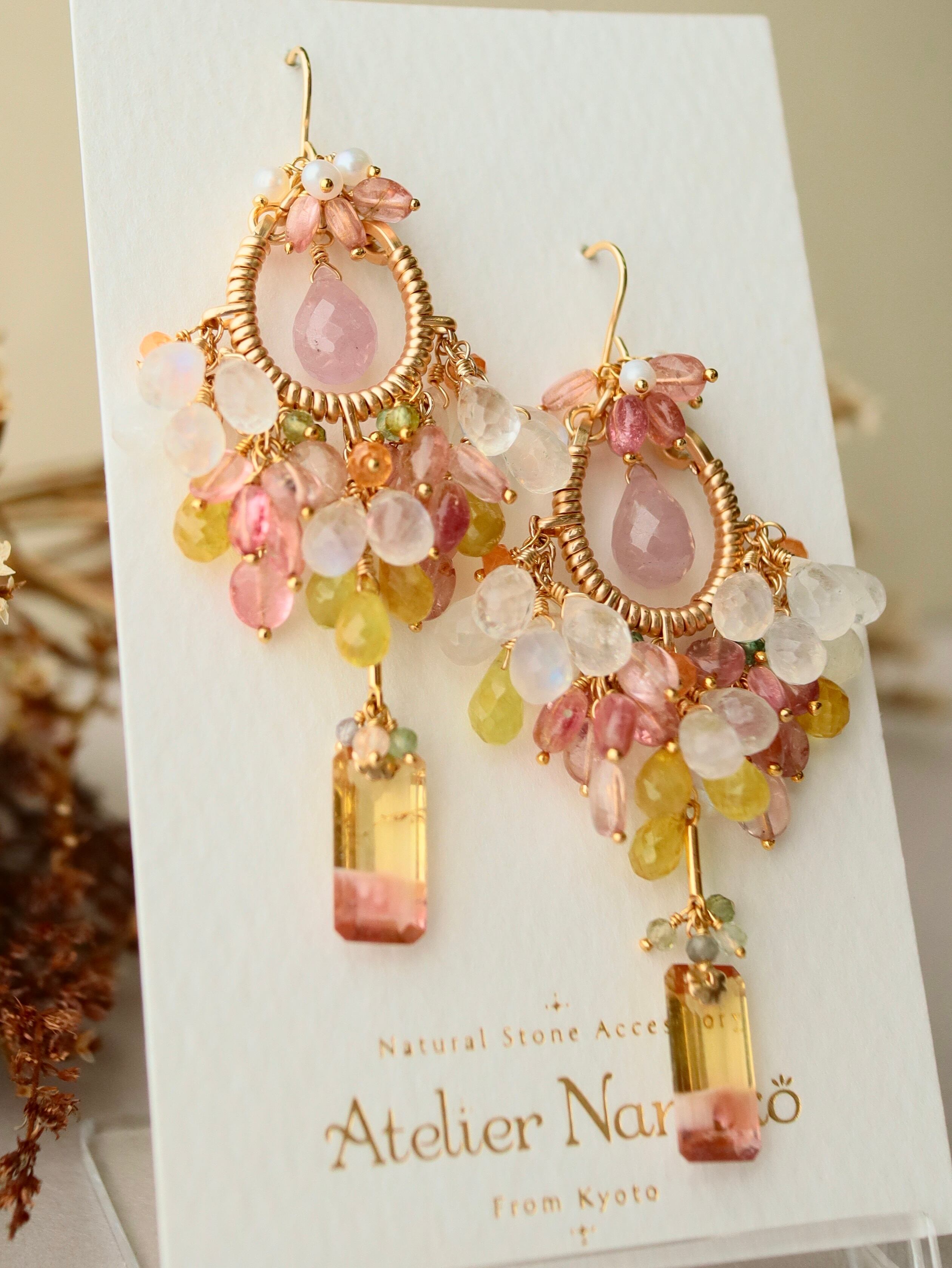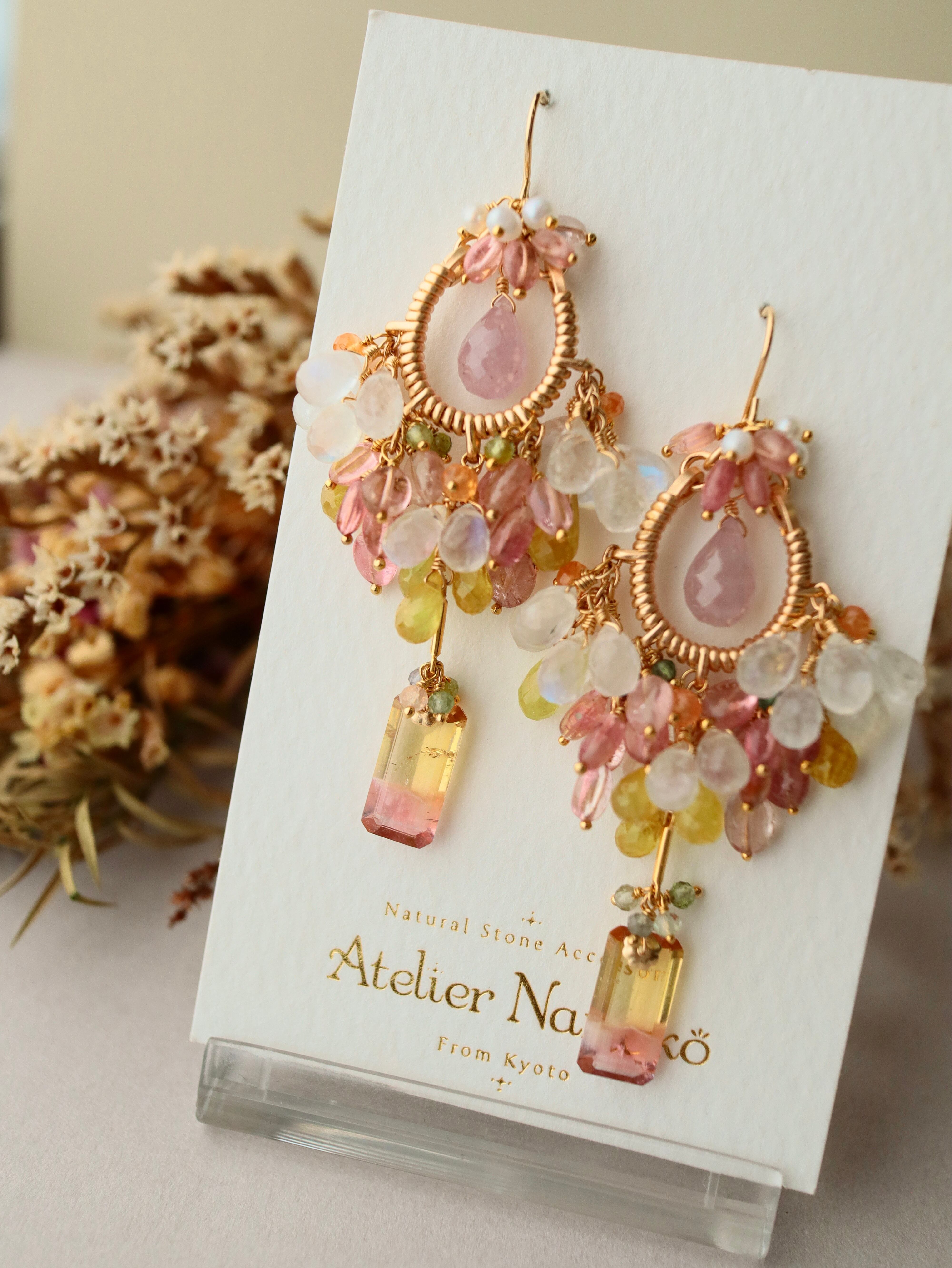 【1点もの/ラウンドタイプ】ピンク×イエロバイカラートルマリンのシャンデリアピアス/イヤリング