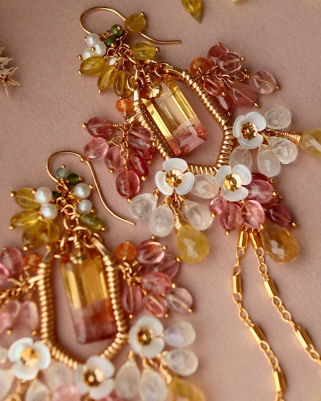 【1点もの/hexagonタイプ】ピンク×イエロバイカラートルマリンのシャンデリアピアス/イヤリング
