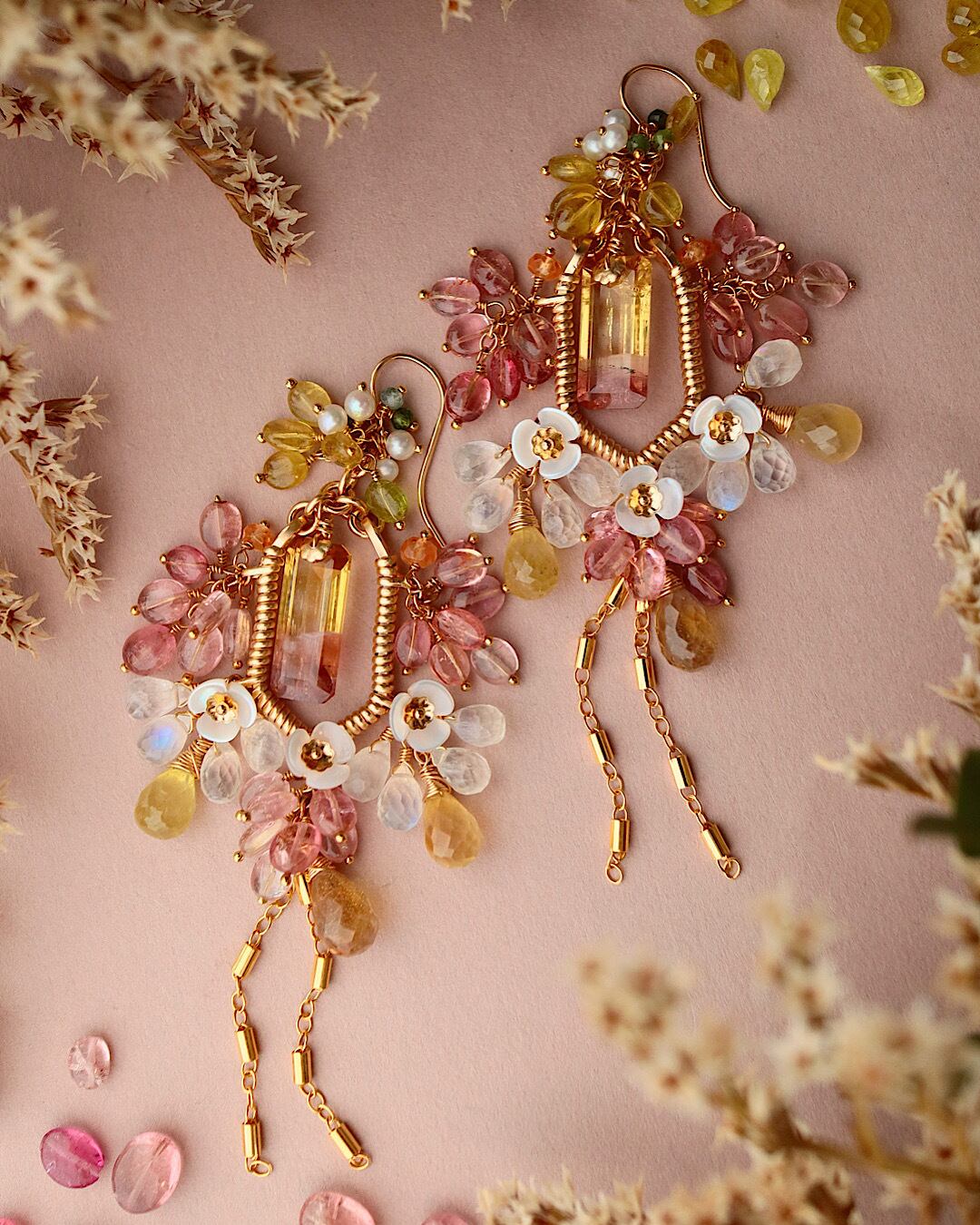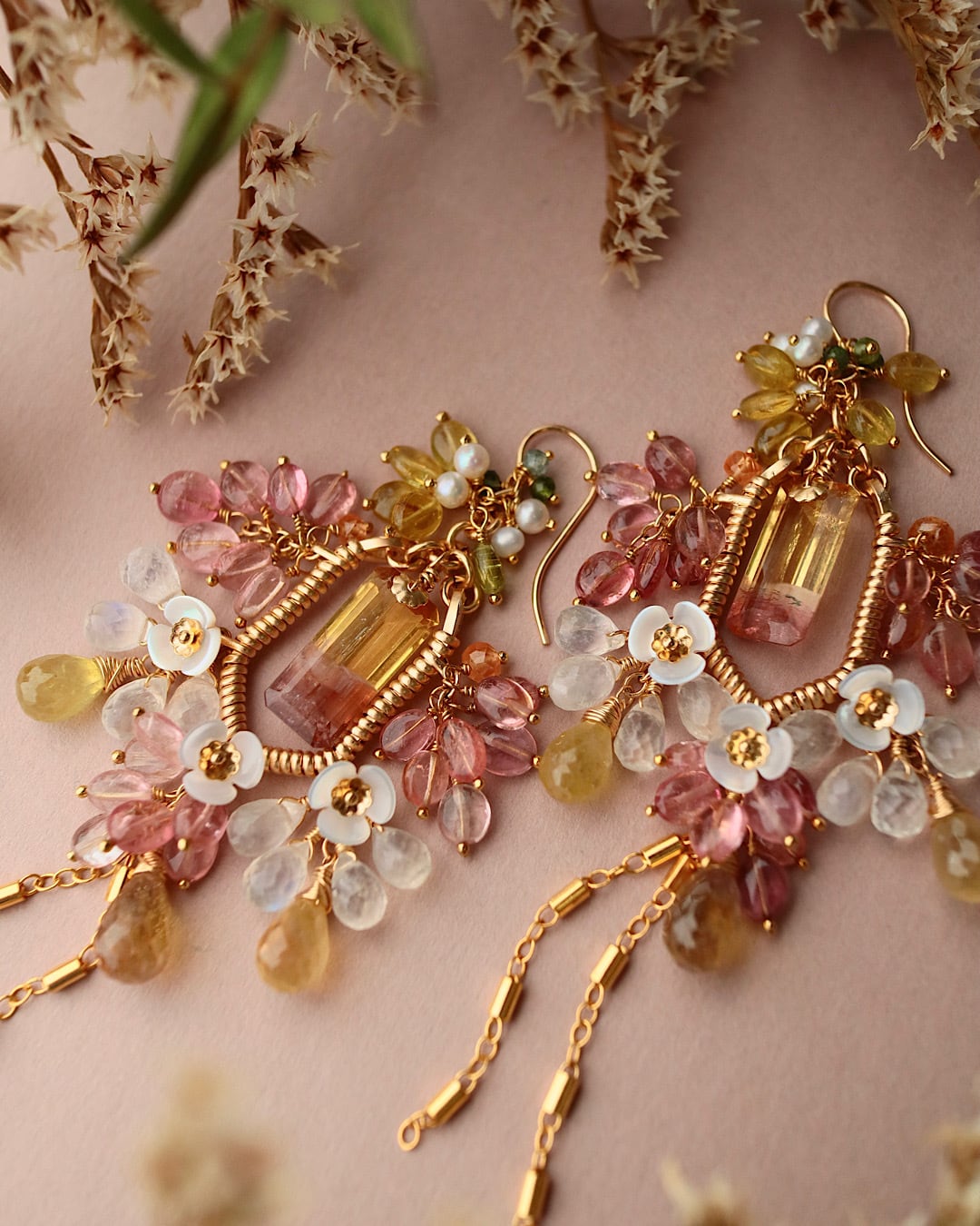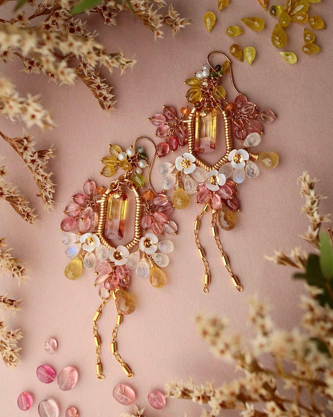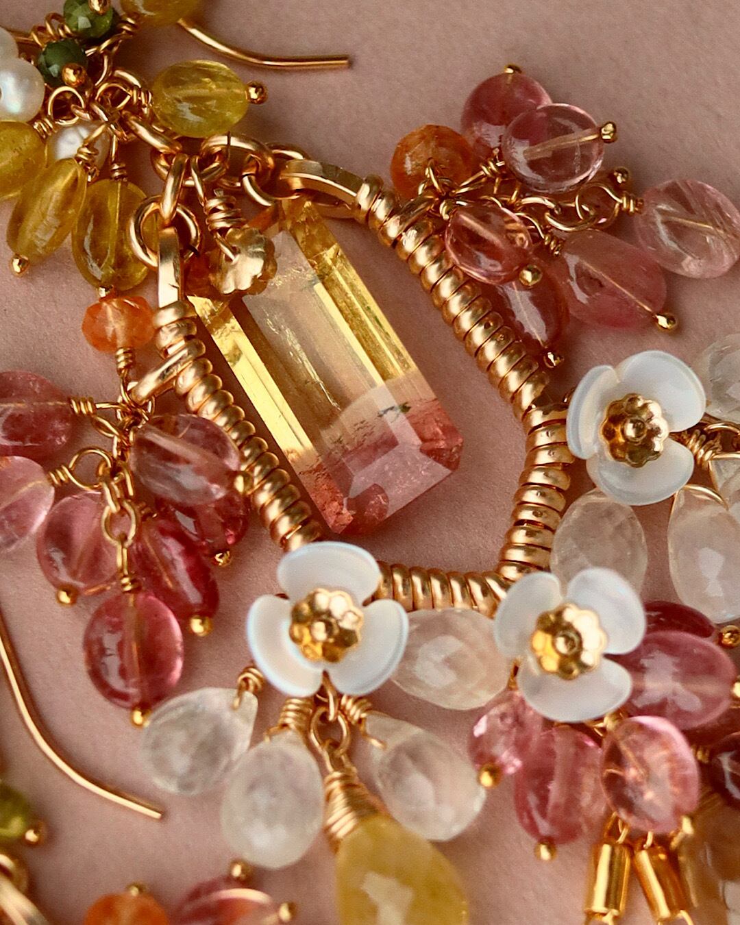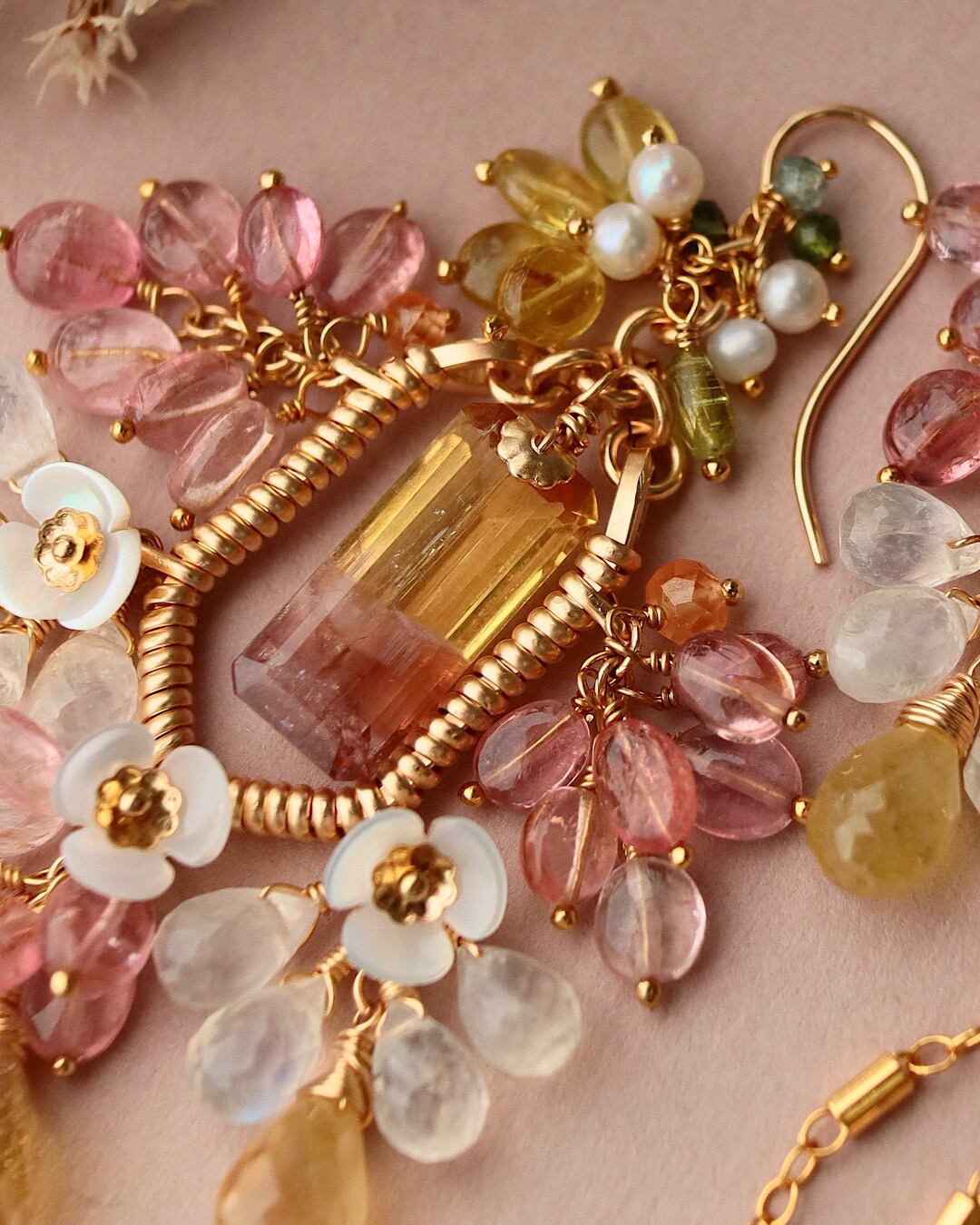 バイカラートルマリン(ピンク×イエロー)、ピンク・イエロートルマリン、イエローサファイア、ムーンストーン、ホワイトシェル、オレンジガーネット